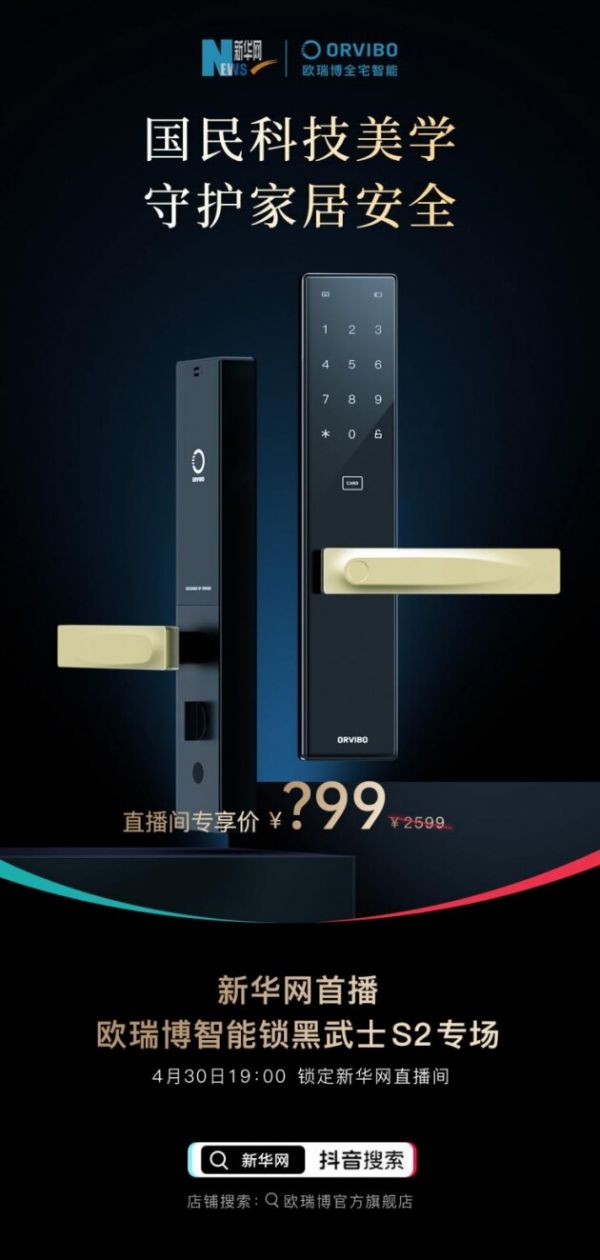 4月30日19时,新华网“优选好物”首场直播将在抖音开播,欧瑞博智能锁黑武士S2将给直播间用户带来怎样的惊喜,敬请期待;届时登录新华网抖音直播间,享优惠福利,一键开启美好的全屋智能生活!