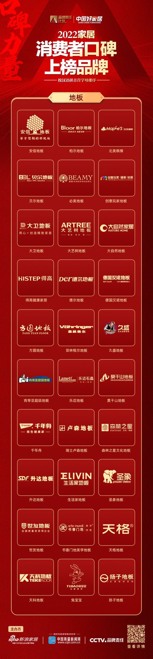 新浪家居讯“洞悉口碑消费之下的价值驱动,用消费口碑见证品牌力量”。新浪家居携手中国质量新闻网、CCTV品牌责任于3月15日-5月10日,全面开展《中国好家居——2022中国家居消费者口碑调查》活动。本次活动由全国工商联家具装饰业协会、中国建筑装饰协会住宅装饰装修和部品产业分会、中国室内装饰协会、中国建筑材料流通协会、中国木材与木制品流通协会、中国轻工业联合会健康家居专业委员会6大协会全程指导,乐居商学院和家页智库为本次活动提供研究支持。通过广大消费者网络问卷调查,千余名行业专家、设计师及家居从业人员综合评审,30家地板企业荣膺“2022消费者口碑品牌”称号。
