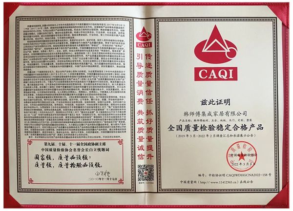 韩师傅集成家居接连八年被颁发“全国产品和服务质量诚信示范企业”、“全国质量检验稳定合格产品”、“全国质量检验信得过产品”荣誉。这是对韩师傅过去努力的肯定,也是对韩师傅集成家居未来进取的鼓励,质量追求与诚信经营对于企业来说是一条永无止境的征途!