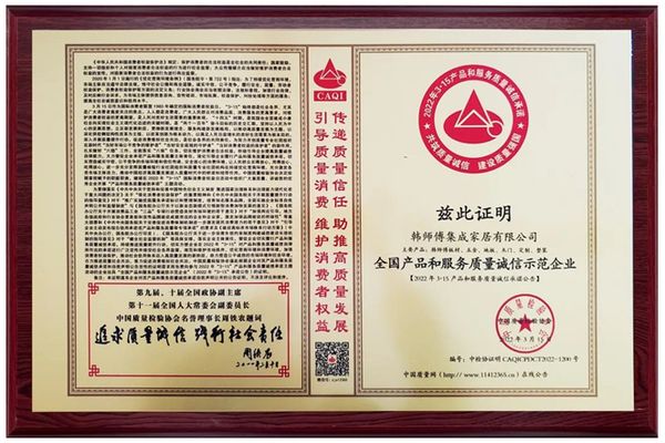 韩师傅再度获得“全国产品和服务质量诚信示范企业”称号