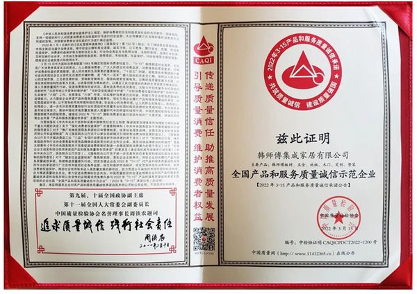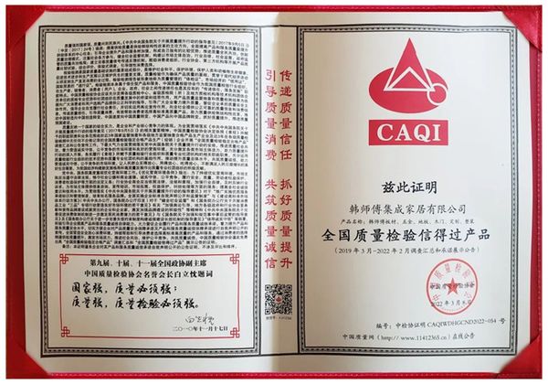 严守笃行,品质至上!韩师傅集成家居在中国质量检验协会主办的2022年“3.15”国际消费者权益日“产品和服务质量诚信承诺”主题活动中,再度荣 获“全国产品和服务质量诚信示范企业”、“全国质量检验稳定合格产品”、“全国质量检验信得过产品”荣誉!