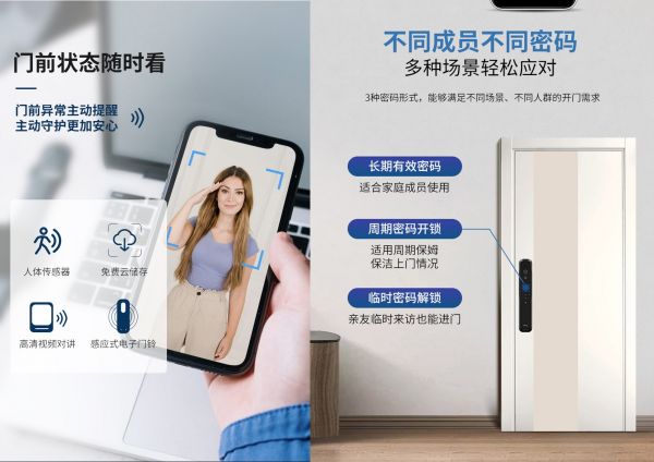 智能猫眼:该功能脱胎于传统猫眼。好太太探索猫眼的“智能连接”可能,将猫眼的可视化功能与手机结合,使用好太太智联app就能收看门外画面。同时智能锁的硬件也进行了升级:160度超广角摄像头让智能猫眼的视线更广、1080P高清画质让手机画面成像更清晰、装设全自动感应器,可自动感应屋外人的非法开门行为并及时向主人提供预警。
