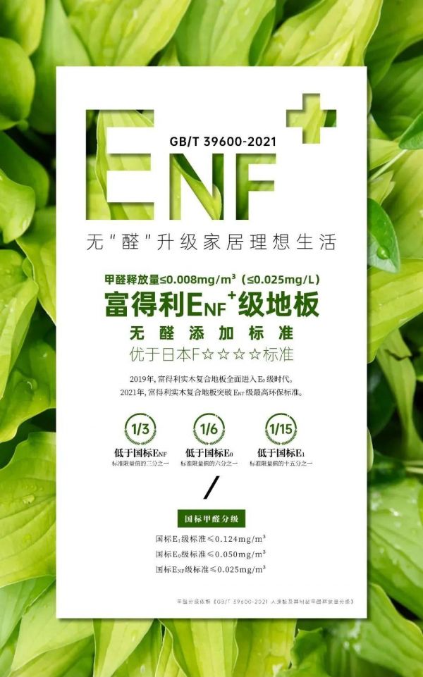 也正因为对产品环保和品质的更高追求,2021年,在新国标颁布前,富得利实木多层地板环保性能就已从E0升级至ENF,甚至优于ENF,国标发布前富得利就已正式开启“ENF+”健康无醛新时代!