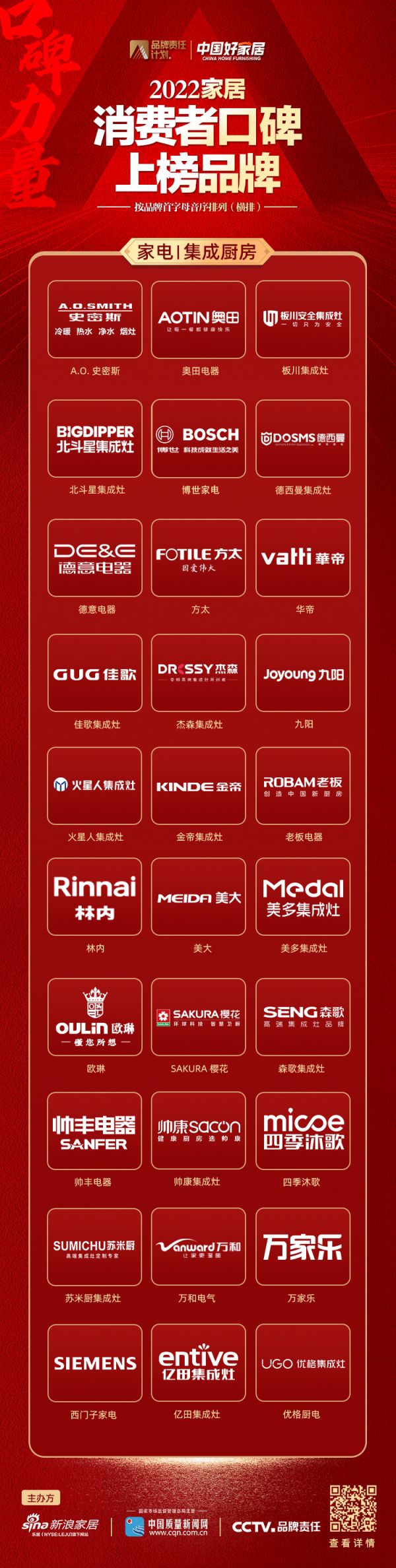 二、“2022家电-集成厨房消费者口碑上榜品牌”总榜(排名不分先后,按品牌名首字母顺序)