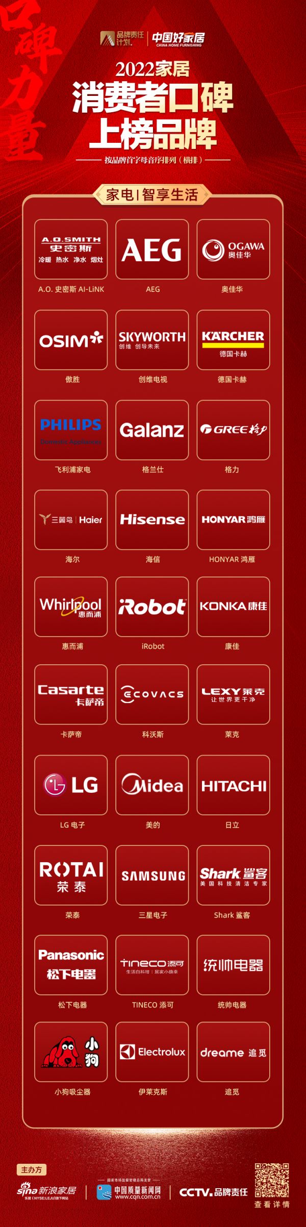 二、“2022家电-智享生活行业消费者口碑上榜品牌”总榜(排名不分先后,按品牌名首字母顺序)