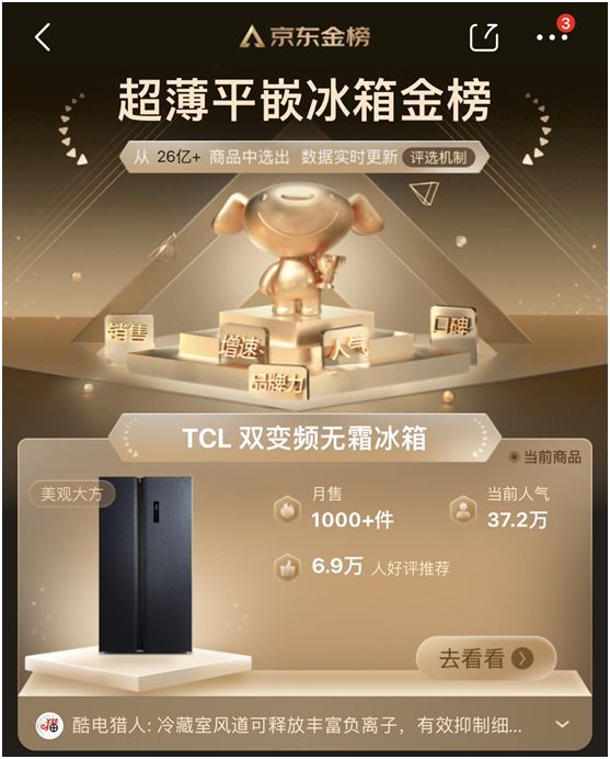 凭借超大的内部容量、合理的内部分区、厚度仅630mm相对较小的占地面积和出众的保鲜性能,TCL 星玄青520大容量冰箱在疫情中给予了用户满满的安全感,并且荣登京东金榜。该榜单作为京东平台的官方权威榜单,是基于真实平台大数据确定入榜的行业与品类。每条榜单不仅是通过算法考量销售、口碑、增速等各方面“纯理性”生成,同时还会邀请专业质检机构和权威媒体及其他第三方为入榜商品评价背书,堪称选购风向标。能够受到消费者的如潮好评和权威第三方的专业认可,足以说明TCL 星玄青520大容量冰箱产品的优秀。