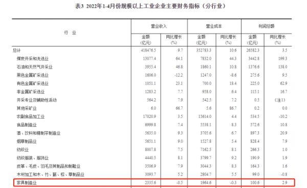 5月27日,国家统计局发布2022年1—4月份全国规模以上工业企业利润数据的公告。其中,1-4月份,全国家具制造业营业收入2335.6亿元,同比下降0.5%;营业成本1964.6亿元,同比下降0.3%;利润总额100.6亿元,同比增长2.9%。