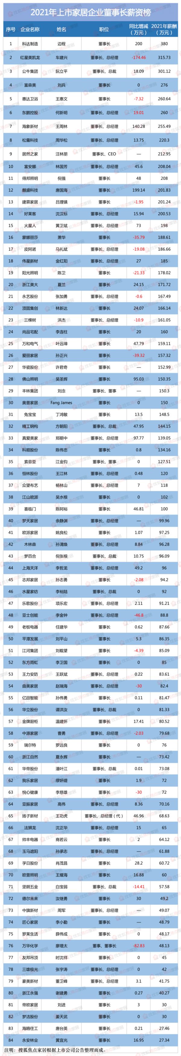 搜狐焦点家居通过公开资料进行整理,发布《2021年上市家居企业董事长薪资榜》。根据榜单显示,在84家家居上市企业中,有46家家居企业董事长均有加薪情况,在84家企业中占比接近半数。其中有5位企业的董事长加薪幅度在50万元以上,值得一提的是,科达制造的董事长边程同比增加200万元薪酬,总额为380万元,位于84家上市家居企业加薪幅度的榜首。