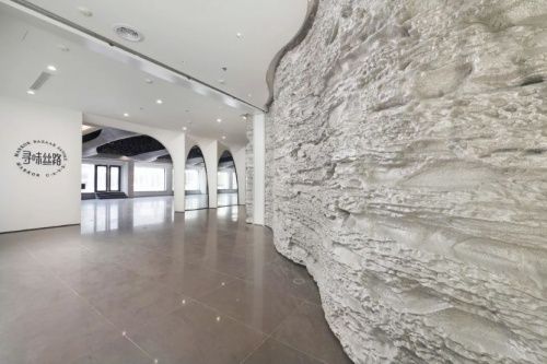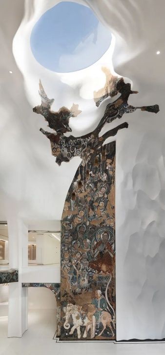 美克洞學館以此为灵感,秉承丝路文脉的设计理念,以洞穴作为意象载体,空间设计受到西域白雅丹地貌及龟兹文化的启迪,采用后现代混搭、叠加的手法,把古典构建以抽象的形式组合在一起,营造圣洁、时尚,充满艺术底蕴的“穴居”文明。表现了人类从洞穴庇护所到室内穴居艺术文化的传承和创新。