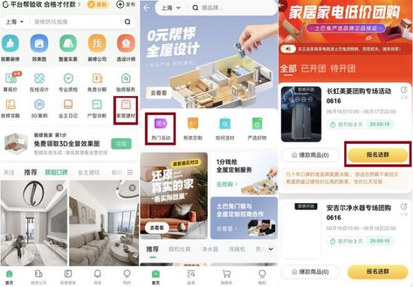 用户可登录土巴兔APP,首页点击“家居建材”进入家居材料专区,随后选择“热门活动”进入活动页面,参加土巴兔的限量秒杀、满减优惠等丰富多彩的活动。用户也可以直接登录“土巴兔家居建材”小程序,然后进入“热门活动”活动页面。