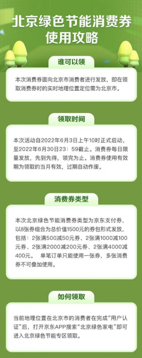 想要入手以上几款产品的消费者,记得下单前先去京东领取消费券,券后价格更优惠。此轮北京绿色节能消费券,以8张券组合为总价值1500元的券包形式发放,包括2张满500减50元券、2张满1000减100元券、2张满2000减200元券、2张满4000减400元券。单笔订单只能使用一张券,多张消费券不可叠加使用,领取当月可使用。