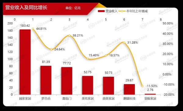 其中,顾家家居以183.42亿元营业收入稳居首位,同比增长44.81%,增幅创九年以来最高。对于营业收入的变化,顾家家居称,主要是销售收入持续增长所致。