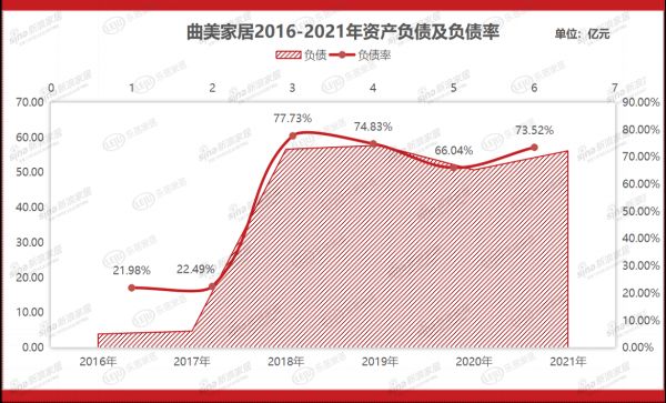 据新浪家居统计,自2018年收购Ekornes之后,曲美家居便开始债务压身。2018年,曲美财报亏损5677.12万元,净利润同比下滑约123%,资产负债率从2017年的22.49%飙升至77.73%。之后,曲美家居的资产负债率一直在70%左右徘徊,2019~2021年,其资产负债率分别为74.83%、66.04%以及73.52%,虽比其他家居企业高,但总体趋向下行。