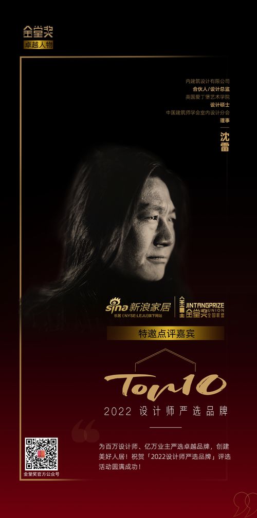 活动汇集国内设计中坚力量,范围覆盖百余城万余设计师,同时32位大咖参与点评。以最强设计师阵容,甄选出服务于设计师及业主的高品质制造品牌。沈雷担任「2022 设计师严选品牌TOP 10」特邀点评嘉宾。