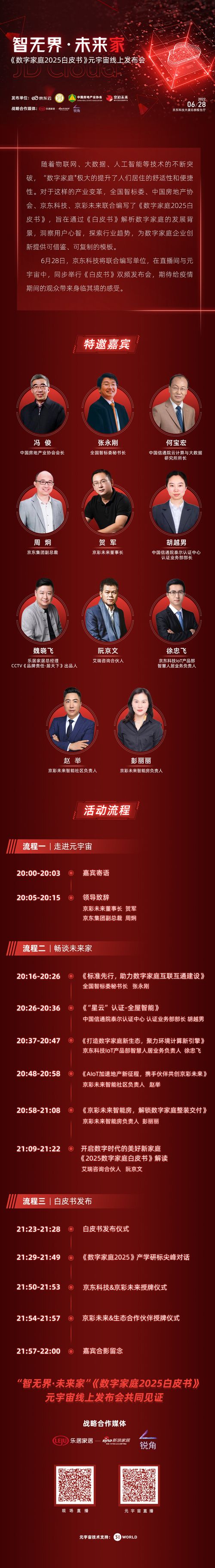 6月28日晚20:00-22:00,京东云联合全国智标委、中国地产协协会和京彩未来举办智无界·未来家《数字家庭2025白皮书》元宇宙发布会,邀请到中国房地产业协会会长冯俊,全国智标委秘书长张永刚,中国信通院云大所所长何宝宏,京东科技副总裁周炯,京彩未来董事长贺军,中国信通院泰尔认证中心认证业务部部长胡越男,乐居家居总经理、CCTV《品牌责任·居天下》出品人魏晓飞、艾瑞咨询合伙人Michael阮京文、IoT产品部智慧人居业务负责人徐忠飞、京彩未来智能社区负责人赵举、京彩未来智能房负责人彭丽丽,对当前中国数字家庭市场进行全方位解读。