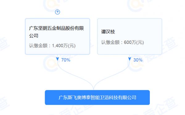 据公开资料,斯飞奥博泰成立于2022年6月6日,注册地位于广东省东莞市虎门镇,法定代表人是谭汉枝,经营范围包括家居用品制造、卫生洁具研发、卫生洁具制造等。目前,斯飞奥博泰由坚朗五金持有70%股权,认缴金额1400万元,谭汉枝持有余下30%股权,认缴金额600万元。