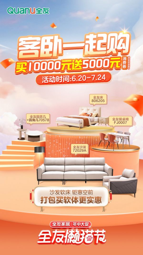 在6月20日活动开启之时,全友线下3000余家专卖店便同步推出了“客卧一站购,买10000送5000”的钜惠活动,覆盖了客厅、卧室这两大家居主要空间的沙发、软床等产品,让用户买得实惠,买得省心。