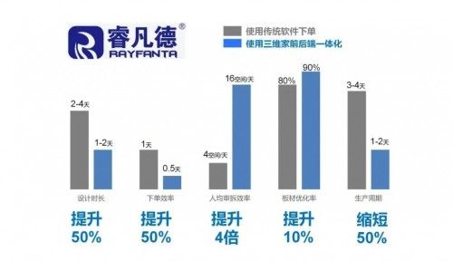 据睿凡德设计总监姚嘉介绍,客户确认好方案效果图,门店可以直接通过三维家软件下单到工厂进行拆单生产,工艺在前端得到规范,让下单效率提升50%,审拆单效率提升4倍,生产出错率大幅降低,生产周期缩短50%。