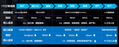 前后端一体化打通,对企业来说是营销、设计、生产、拆单各节点的一次变革。“数据流可以从前端一直通到后端,从意向客户到安装交付,都有数据可查可循,有效地把控订单进度。”杨雄滨表示,一个软件就可以完成效果图、设计方案定稿、报价签单、审核订单等流程,流程得到有效的简化,减少软件转换和对接次数,让工作效率提升30%以上。