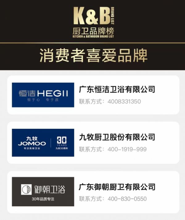 2022年6月,恒洁卫浴,九牧卫浴,御朝卫浴凭借在卫浴领域出众的创新研发能力、过硬的产品质量和突出的市场表现,荣获2022厨卫品牌榜“消费者喜爱品牌”!