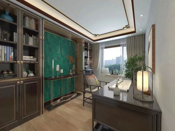 书房选用卷轴、博古架等文化符号来表达东方意境。整体以胡桃木搭配祖母绿,复古端方,书卷气息浓郁。一书墨痕,半卷清词,书香墨韵。案上宫灯造型的台灯,昏昏然,漾出满室风雅。