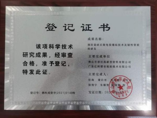 企业一直以来坚持技术创新,推进智能化制造,走高质量发展之路。近年来,与多家科研院校开展产学研合作,科研成果累累。2021年,由佛山市卓仕高新型材料有限公司、广东亿固壁安粘贴技术有限公司联合承担的两项科研成果通过鉴定。