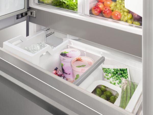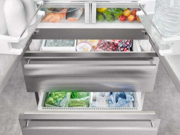 Liebherr利勃海尔冰箱CBNes 6256的外观设计简约时尚,从体型上来说,与传统对开门冰箱相比也更为小巧,在厨房可作嵌入式设计,完美融入就餐区域。它上部的冷藏室为典型的法式双开门设计,内部为无竖梁的超大储藏空间,实用性能强大;下部的冷冻室为两抽屉设计,相较于传统的对开门冷冻室来说,可利用的空间更大。简单来说,与CBNes 6256净容积相同的传统对开门冰箱,体型不一定有它小巧;与CBNes 6256总容积一样大的冰箱,不一定有它能装。