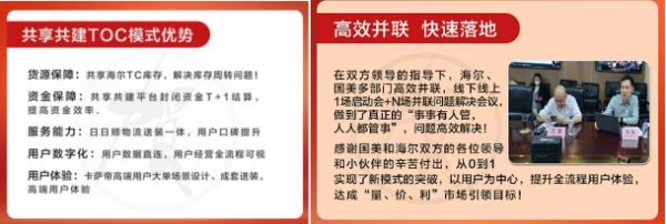 为了确保国美电器&海尔共享共建TOC新模式快速落地,双方多部门之间“高效并联”。通过线上线下1场启动会+N场问题并联会,国美电器与海尔携手将遇到的痛点与难点问题一一高效解决,顺利打通新模式的各个环节,有力推动了共享共建TOC新模式快速落地。在该模式下,海尔推出30余款独家商品专供于国美电器,这也是该模式的一大亮点。