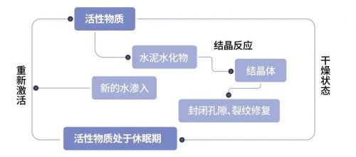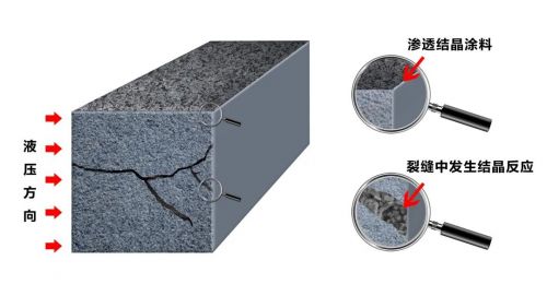 结晶体,是通过渗透结晶中的活性物质,在有水的条件下,渗入基层内部与水泥构件形成的。无水时,渗透结晶中的活性物质处于休眠状态,当混凝土再现细微裂缝有水渗入时,它便与水作用,再次生成不溶性纤维状的结晶,具有独特的永久自修复能力。