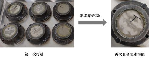 其自修复性可通过GB 18445-2012《水泥基渗透结晶型防水材料》中“第二次抗渗压力”来表征。具体的做法是:水泥基渗透结晶型防水材料的渗透试件经第一次抗渗实验透水后,在标准养护条件下,带模在水中养护28d后,进行测试,看是否再次具备抗渗能力。
