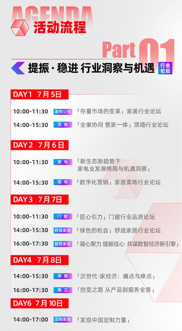 其中,“提振·稳进—行业洞察与机遇行业系列论坛”下设装饰公司、顶墙、家电、卖场、门窗、舒适家居、智能家居、家具、陶卫、定制家居等10大细分行业论坛,具体论坛安排时间如下: