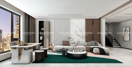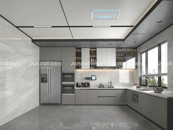 厨房墙面和吊顶使用白色、灰色等浅色的色彩,不仅能为居室带来视觉上的清凉感,而且可降噪减压,还能起到冬暖夏凉的作用;欧斯宝墙面平整无缝且易于清洗;在设计方面,简约大气,给人舒适感。
