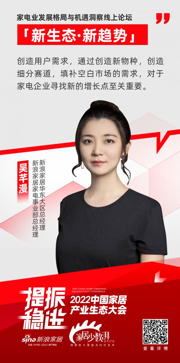新浪家居家电事业部总经理兼华东大区总经理吴芊漫对此次家电论坛的成功举办表示祝贺,她指出创造用户需求,通过创造新物种,创造细分赛道,填补空白市场的需求,对于家电企业寻找新的增长点至关重要。