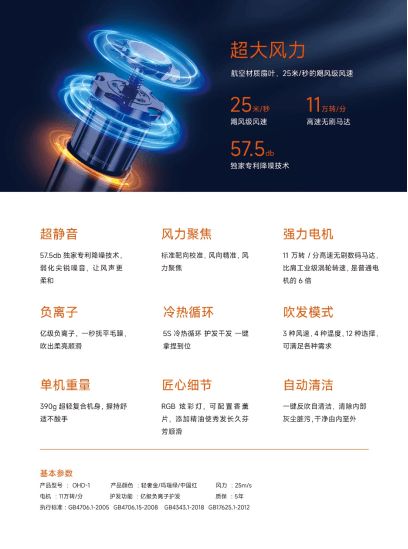 代表着核心功能的风力输出方面,这款产品配置了11万转的高速无刷数码马达,可实现25m/s的出风口气流,仅需要3分钟即可吹干头发,不会浪费用户宝贵的时间。同时,吹风机在设计时还注重优化马达性能和风道设计,并安装了智能热感测器,前者可以优化气流振幅,减少吹发的噪声影响,给用户带来更佳的吹发体验;后者则可以实时监测吹风的温度,避免高温烘烤发丝,保留秀发水润。