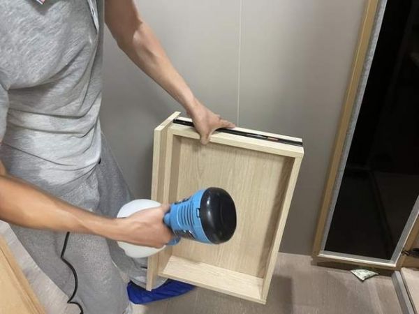 抽屉抽出之后,将内部的5个面和抽屉的18个面全部清洁,确保接下来要喷涂的产品更好的渗透,长久地附着在29个面上,可持久的净化分解有害气体。