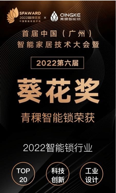 青稞智能锁凭借自身的创新实力、设计实力和研发实力在众多参选品牌中脱颖而出,一举斩获“2022智能锁行业科技创新产品奖”、“2022智能锁行业工业设计产品奖”、“2022智能锁行业TOP20”三项奖项。