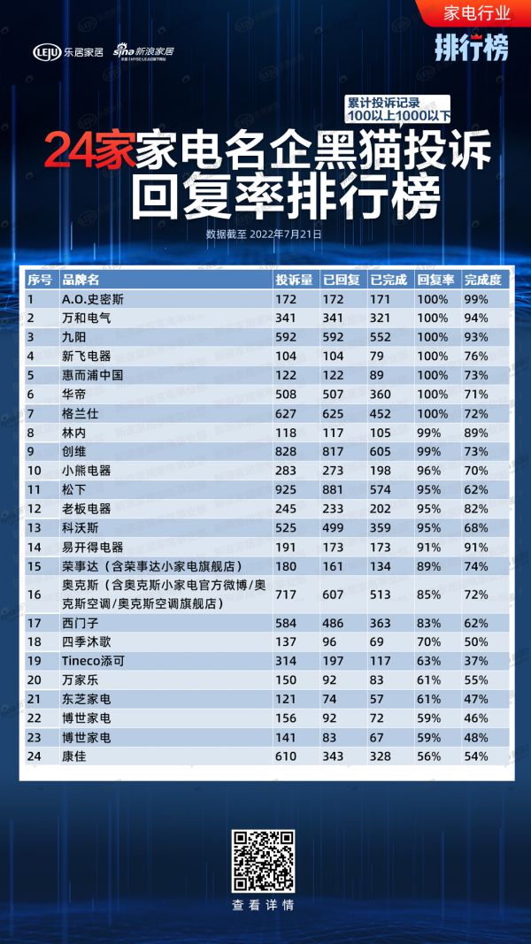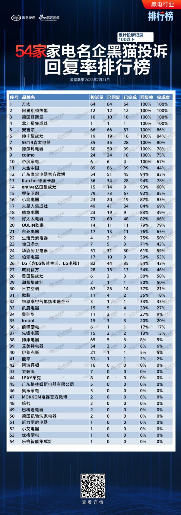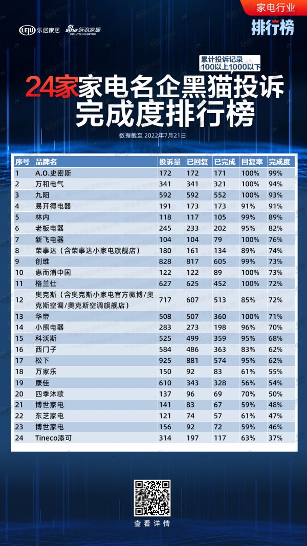 2022年7月家电名企黑猫投诉完成度及回复率排行榜数据情况一览