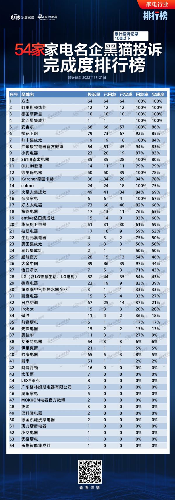 2022年7月家电名企黑猫投诉完成度及回复率排行榜细榜