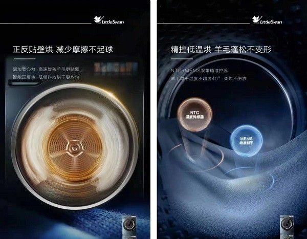 小天鹅本色系列干衣机搭载专业M5羊毛柔烘技术,通过“正反贴壁烘”和“精控低温烘技术”,将烘干温度控制在40℃左右的低温区间,控制羊毛织物之间及与烘干机内桶之间的摩擦及摔打频率,有效避免高温下的定向摩擦造成羊毛收缩及毡化等现象,完美满足用户对于各类衣物烘得快、烘得净、烘干静、烘得匀、烘得平的多元需求,解决了长期以来困扰在干衣产品的磨损、缩水和烘干三大性能难题,带给国民消费者高品质的干衣体验。