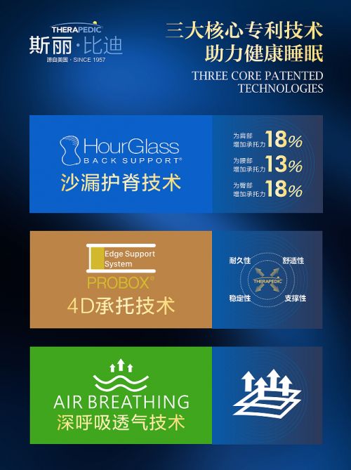 斯丽比迪拥有Hour Glass® 沙漏护脊技术 、AirBreathing深呼吸透气技术、SuperPROBOX® 4D承托技术,三大全球核心技术和强大的睡眠研究中心所极力打造的床垫,致力为中国消费者构筑独有的恢复性睡眠,重新定义健康睡眠的涵意。