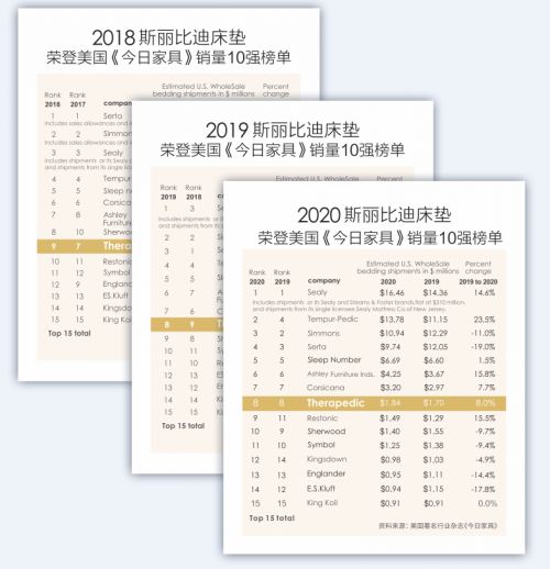 经半世纪时光淬炼, THERAPEDIC 品牌以“恢复性睡眠”魅力赢得了全球消费者的青睐。连续多年稳居美国权威杂志《今日家具》销 量榜单前十品牌,并保持持续稳定增长的态势,美梦可期。