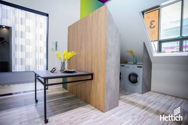 50平米变形公寓打破既定的空间布局,依据需求变换客厅和卧室的空间大小,同样也能在餐桌后方变出一个洗衣房,尽情施展空间魔法。