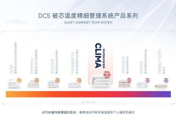 展会现场,DOWNLAND将Duvet Comfort-temp System被芯温度精细管理系统做了更多的可视化表达。基于对睡眠的专业理解,将被芯定义根据不同的tog值和不同材质进行了区分为不同的环境温度和个人偏好。并配合该系统上线了相关应用程序,用户通过应用程序可根据身体特性和生活环境,以及个人睡眠习惯和特殊要求,满足自由搭配组合的需求。为自己及家人量身定制一人一款的私人床品。