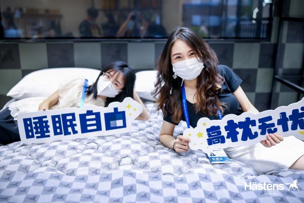 此外,展会期间,海丝腾经典明星产品在5号馆展位亮相,清新蓝白格绽放海丝腾风采,吸引权威媒体和KOL前来深入了解。在海丝腾睡眠顾问的介绍下,大家躺在不同床具上感受海丝腾对身体的最佳承托感,热烈的现场气氛也引得众多观展人员纷纷前来体验,并手持道具牌拍照留念。