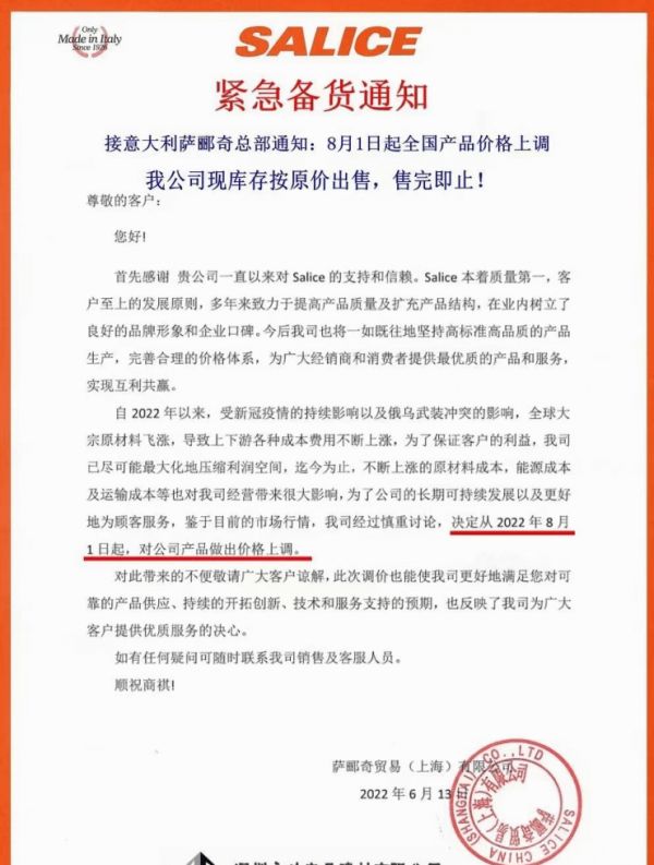 自2022年以来,受新冠疫情的持续影响以及俄乌武装冲突的影响,全球大宗原材料飞涨,导致上下游各种成本费用不断上涨,为了保证客户的利益,为了公司的长期可持续发展以及更好地为顾客服务,鉴于目前的市场行情,萨郦奇决定从2022年8月1日起,对公司产品做出价格上调。