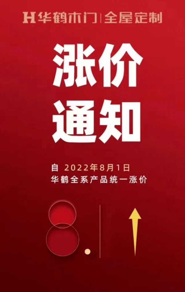 华鹤木门,全屋定制宣布自8月1日起,华鹤全系列产品涨价。