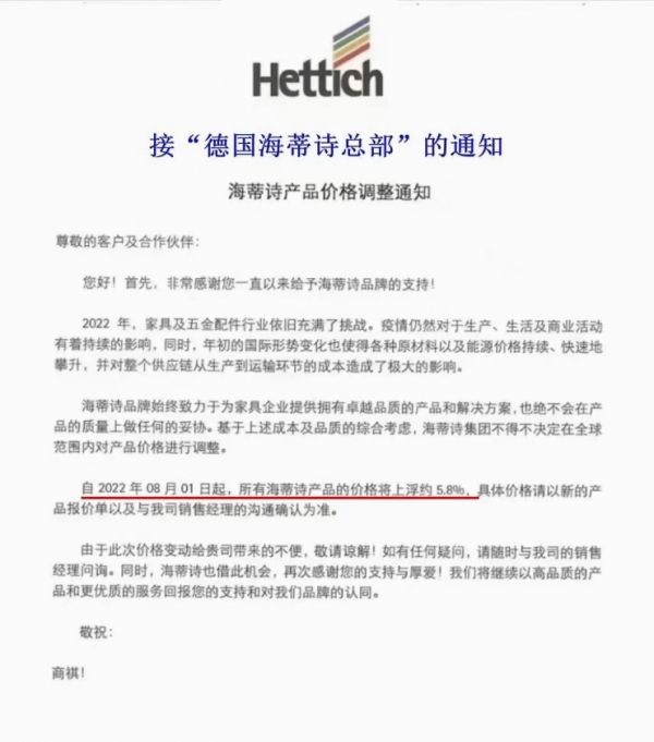 海蒂诗五金最新通知,受国际原材料价格上涨及能源价格持续、快速攀升,对整个供应链从生产到运输环节成本影响很大,自8月1日起,所有海蒂诗产品将上浮约5.8%。