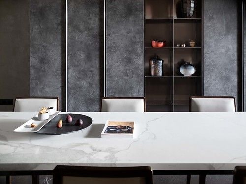 岩板的庄重与黑金的神秘打造出别样的“诧寂”之感,空间的铺叙看似平淡素雅,设计将思考的切面还原到居住,将生活的所有降回本质,由此映射出居住者日常的充实和情感的丰富。