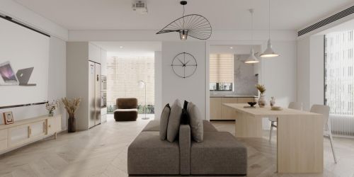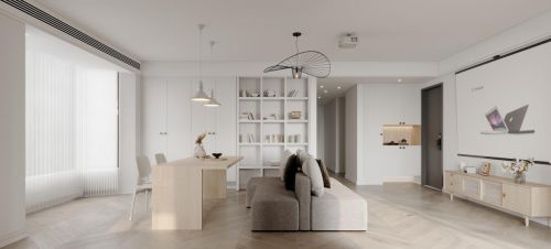一家四口居住的房屋,客餐厅的布局没有按照常规的设计方式,两个空间取消了明显的界限,一体化的设计让视觉上更显宽敞。原本的客餐厅空间经过改造后,增加了学习、办公功能,让一家四口既可以在此处交流情感,又可以有一个舒适的空间进行学习与工作。
