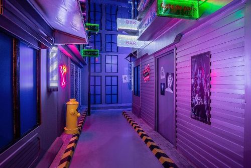 本案是一个沉浸式剧本杀馆,我们以赛博朋克风格的设计为主题,提到这个风格,首先我们想到的是废旧的街区、闪烁的霓虹灯以及布满涂鸦的小巷,所以在设计中,以巷子为主要主题元素来进行扩散,街区每个门的背后都是一个个风格迥异的房间,让游戏者最大化的体验到环境落差。